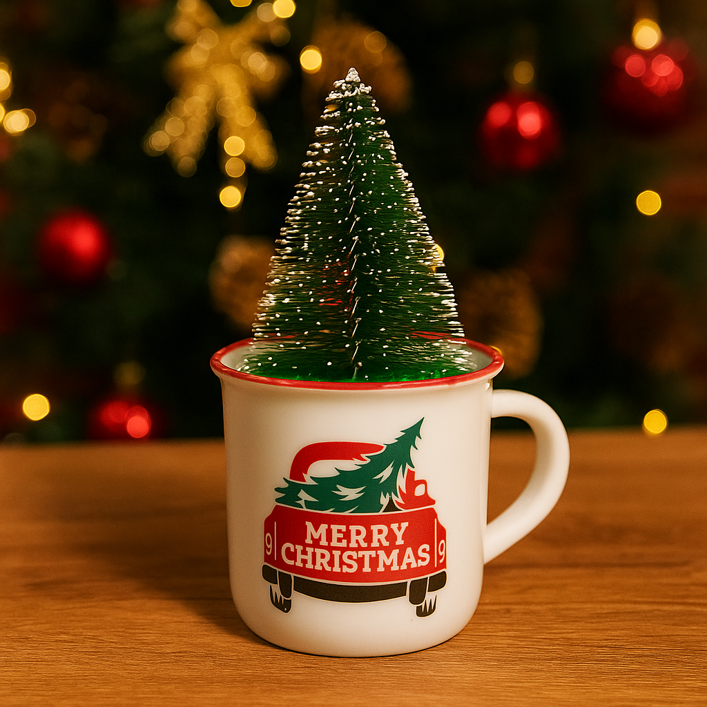 Enfeite Natalino Caneca com Pinheiro 10x7cm – Decoração Charmosa e Criativa para o Natal