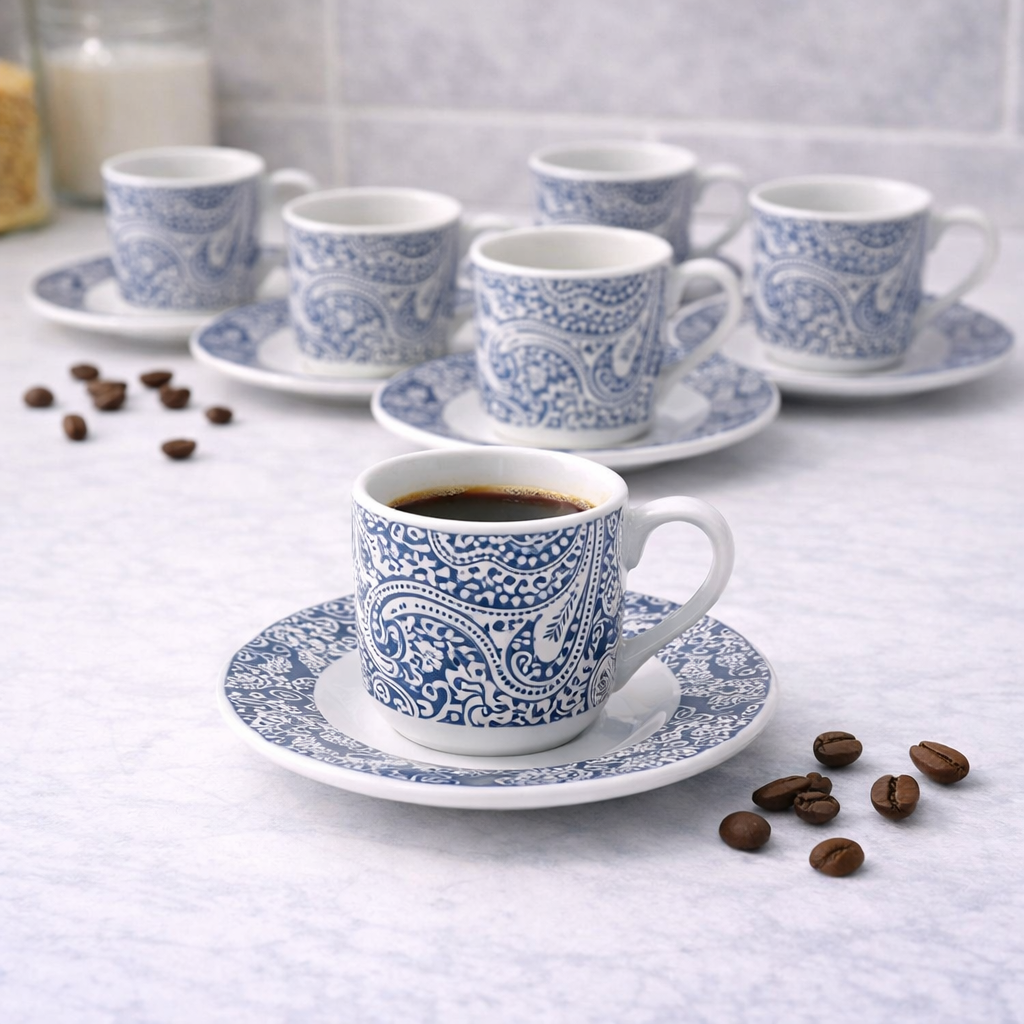 JOGO DE XÍCARAS DE PORCELANA COM PIRES PARA CAFÉ BLUE FLORAL – 12 PEÇAS | 90ML – LYOR