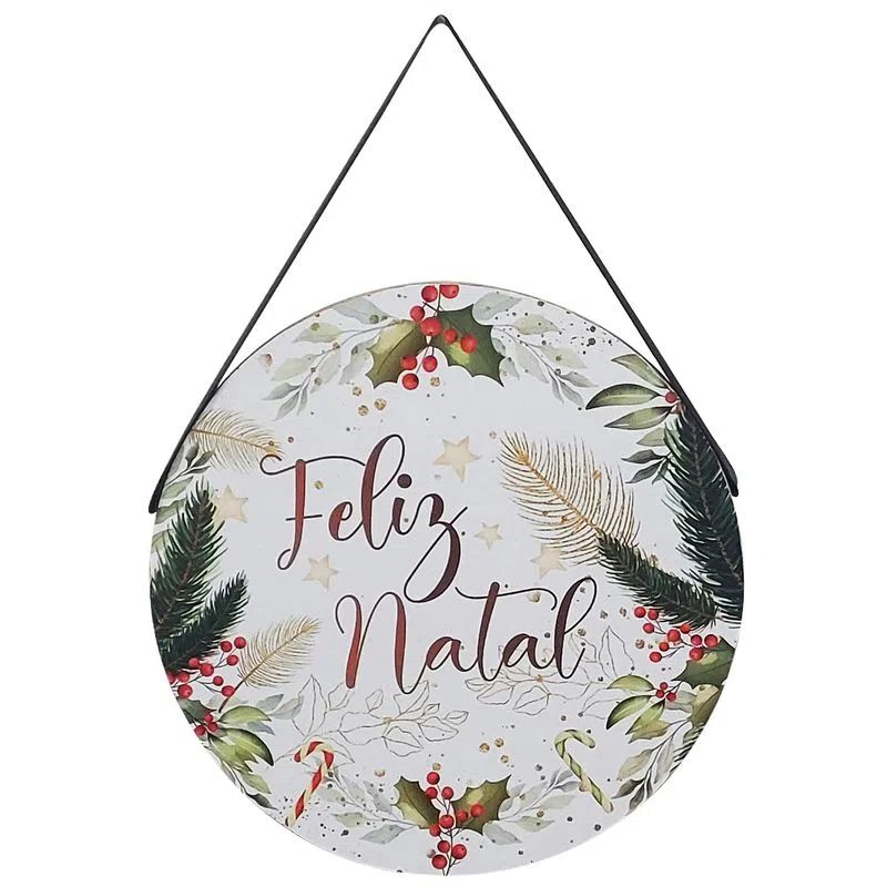 Placa Redonda -Natalina -Feliz Natal Folhagem -C/ Alça Medidas: 20cm Composição: Madeira NSW Código de Barras: 7908151530595 Peso: 0,286Kg Ref.: JPL2181
